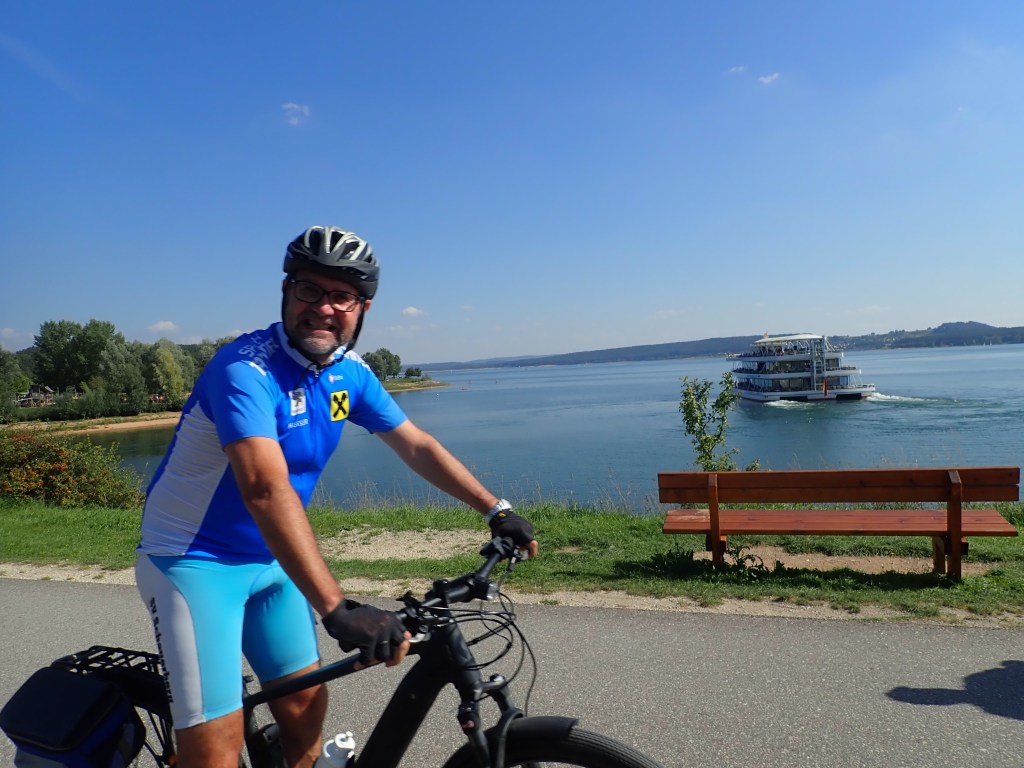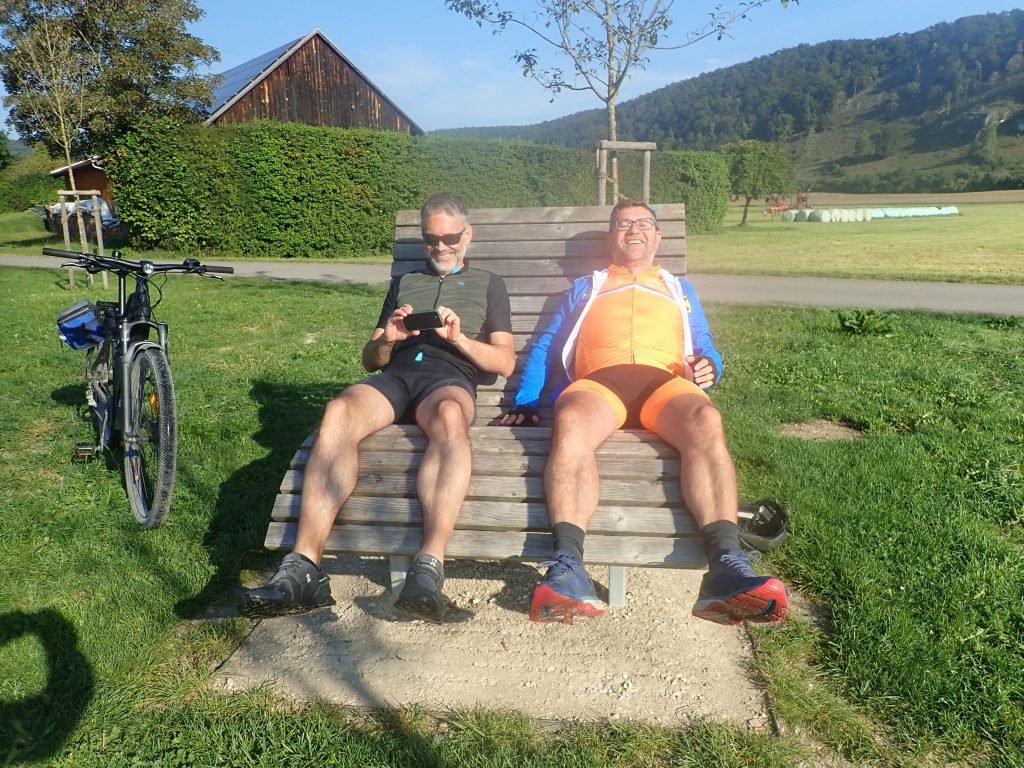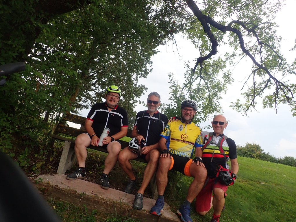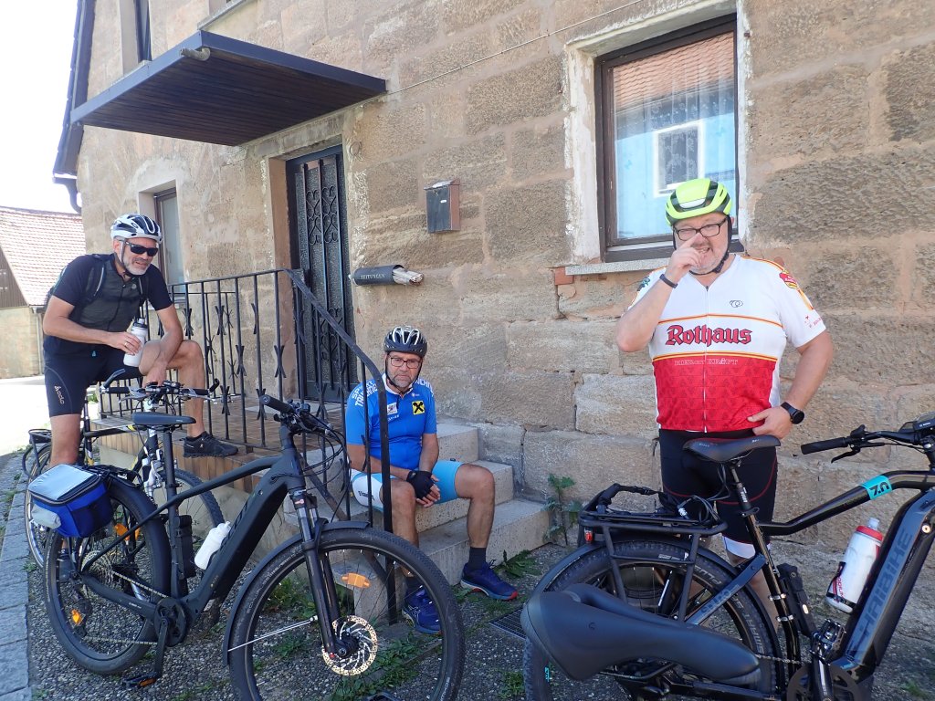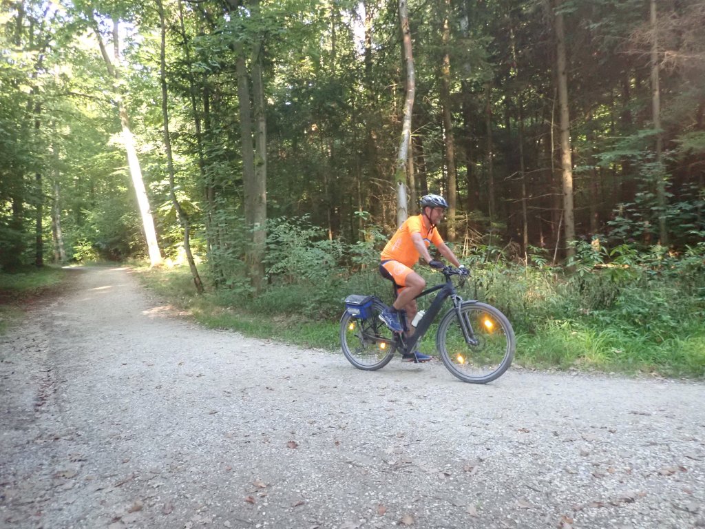 Von Sepp, unserem Fahrer und Begleiter, wurden wir, Nik, Heli, Bernhard und ich, sicher nach Roth kutschiert und starteten von dort um 13:00 Uhr die Forstradtour 2023. Kurz vor dem ersten Labestopp gabs eine erste Steigung, die Bernhard, dem e-bikelosen Jüngling nur kurz zum Schnaufen brachte. In Endorf am Großen Brombachsee war bei herrlichem Wetter einiges los und es dauerte ein Weilchen, bis das Selbstbedienungsrestaurant die Nudelgerichte fertig hatte.