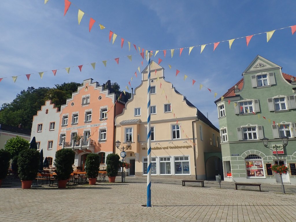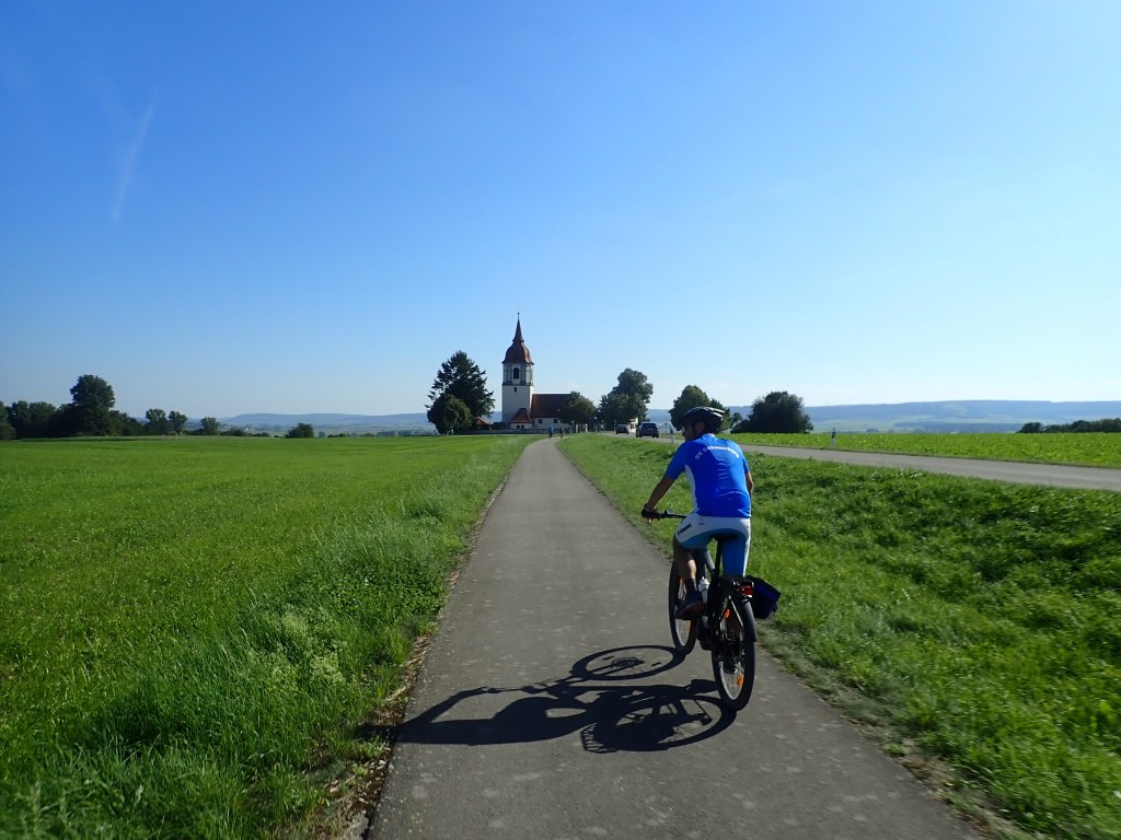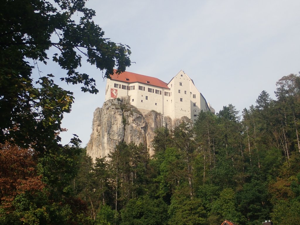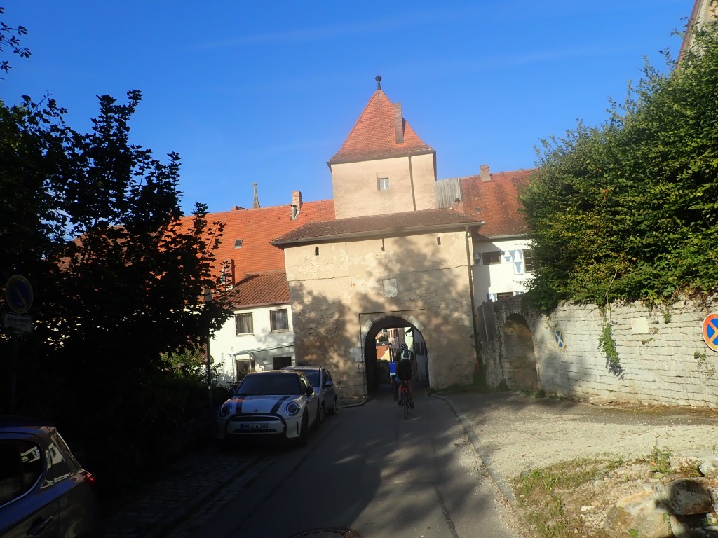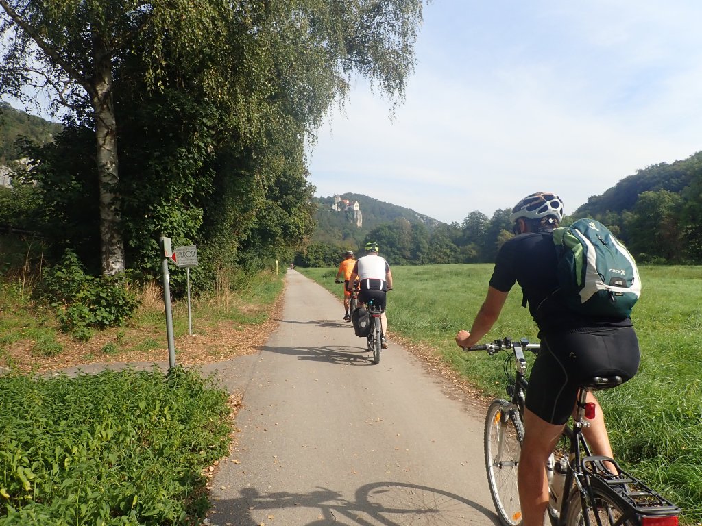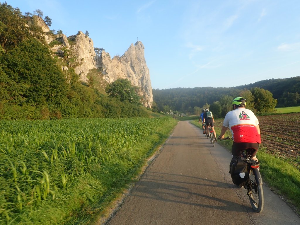Am frühen Nachmittag erreichten wird Gunzenhausen und somit das Altmühltal, welches wir in der Folge bis zu ihrer Mündung in die Donau bei Kelheim durchradelten. Anfangs war die Altmühl nur ein schmales Rinnsal, entwickelte sich aber bald zu einem netten Bächlein. Beeindruckend waren die immer wieder zu Tage kommenden weißen Jurafelsen an den Flanken beidseits des Tales. Der erste Nächtigungsort war das Hotel Adler in Eichstätt. Die Stadt ist Sitz des gleichnamigen Landkreises sowie der Verwaltung des Naturparks Altmühltal, außerdem Bischofssitz des Bistums Eichstätt und Hauptsitz der Katholischen Universität Eichstätt-Ingolstadt. Die im Zuge des Abendessens von Nik vorgebrachte Weißwurstbestellung fand bei der reschen Kellnerin keine Symphatie. „Weißwürscht gibts nur bis Mittags, die dürfen das Zwölfeläuten nicht hören!“ Die Kellnerin hat unseren Test betreffend bayrischer Gepflogenheiten bestanden.