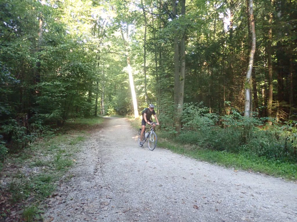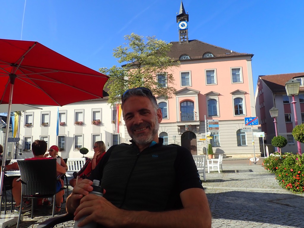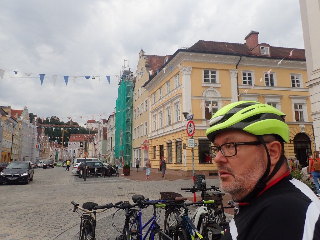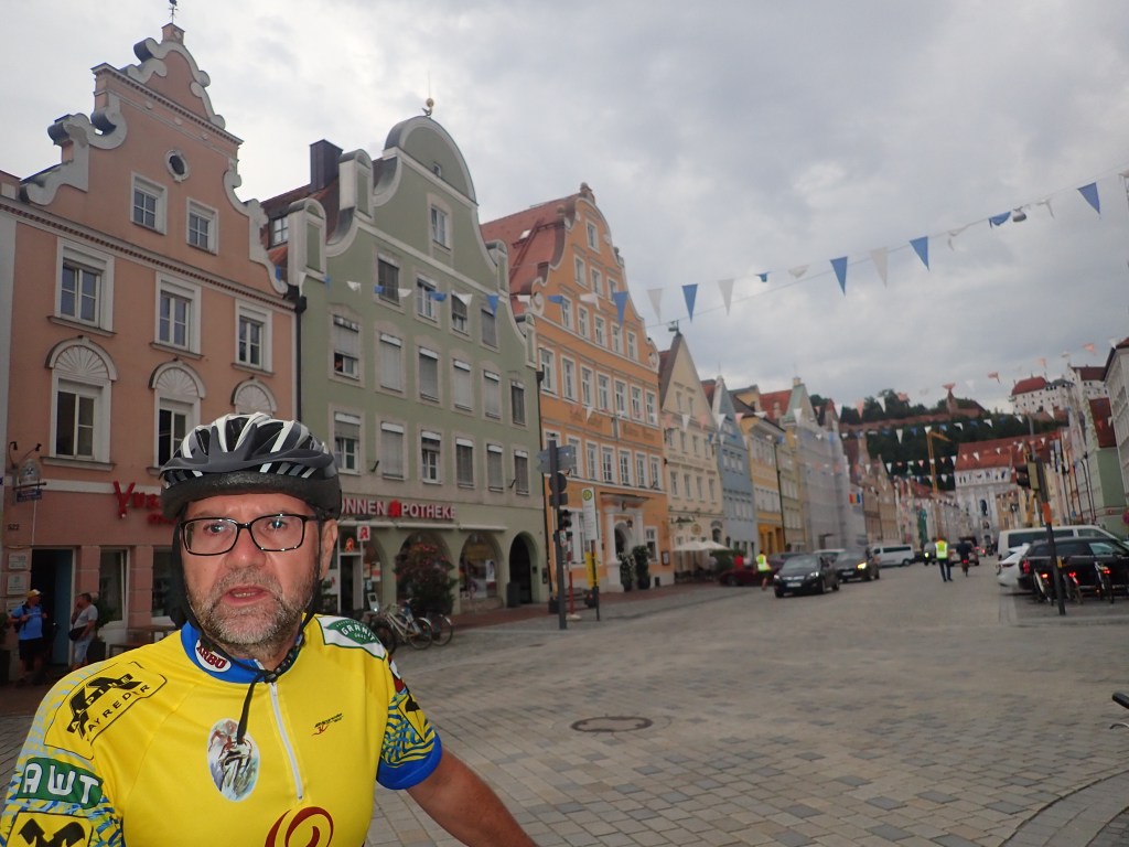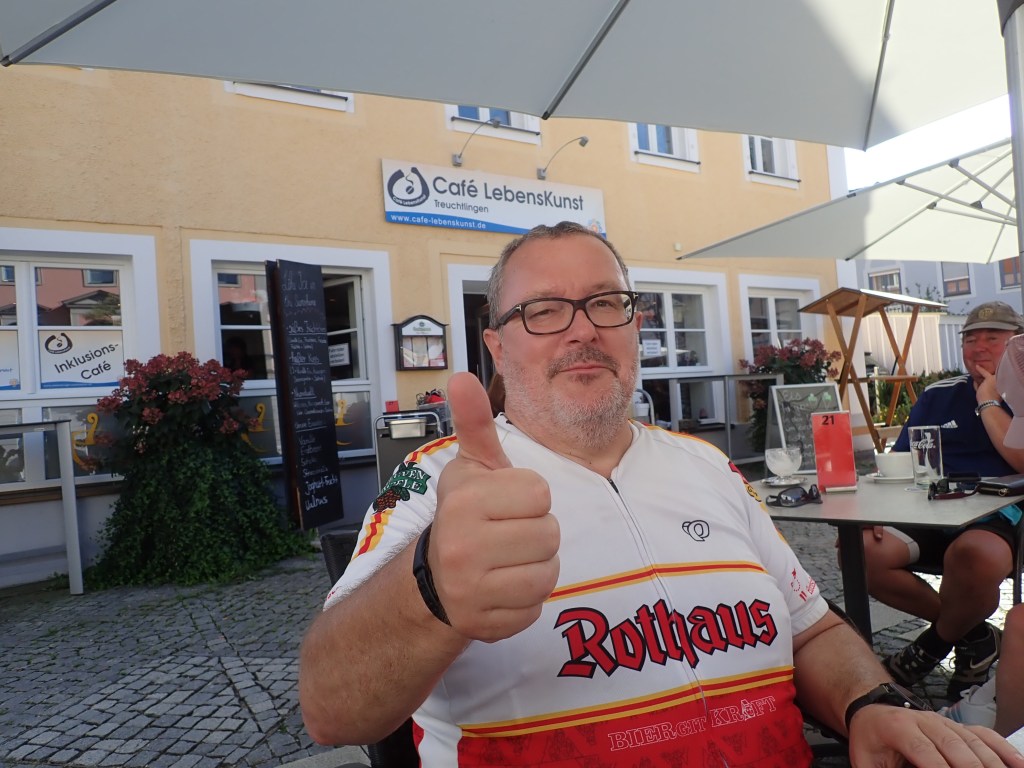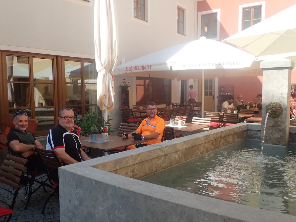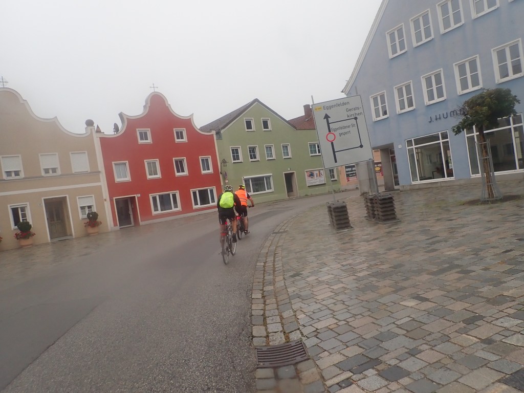 Tag drei führte uns durch hügeliges Gelände über Rohr in Niederbayern mit einer beeindruckenden Klosterkirche und Rothenburg an der Laaber bis Landhut, wo man im ältesten Wirtshaus der Stadt, dem „Firmer Bräu“, gegr. 1434 eineBiolandente speiste. (Bernhard begnügte sich mit Linsen). Verschlungene Wege führten uns vorbei an Vilsbiburg über Neumarkt/St. Veit ins Rottal. Diesem folgend erreichten wir begleitet von leichtem Nieselregen unseren letzten Nächtigungsort, Eggenfelden. Die freundliche Dame an der Rezeption des Hotel Garni Leitl bemühte sich sehr, uns ein gutes Lokal zu vermitteln, was schließlich mit dem italienischen Restaurant Alice auch gelang. Nach der Pizza samt ausreichend Bier noch ein Eis und als Absacker ein letztes Bier im Gasthaus „Unser Wirtshaus“ und ab ins Bett.