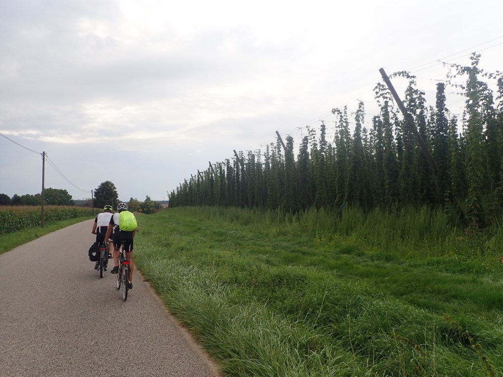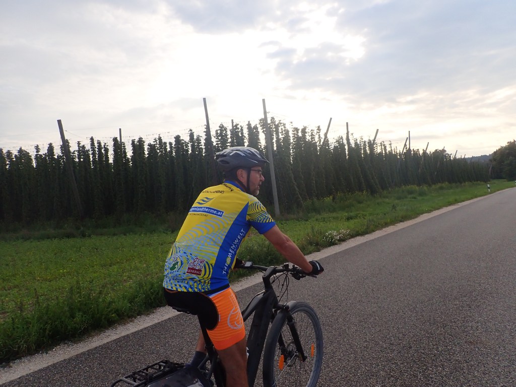 Am zweiten Tag genossen wir weiterhin das Altmühltal, die Temperaturen bewegten sich um die 30 Grad Celsius, einige Pausen waren notwendig. In Kelheim ein kurzer Besuch im Biergarten der Brauerei „Schneider Weiße“, dann gings halbwegs steil durch den Wald bergauf um nach einer rasanten Abfahrt das sehenswerte Benediktinerkloster Weltenburg an der Donau zu erreichen. Die letzten Kilometer bis nach Abensberg führten uns am Rande des mit 2.400 km² größten zusammenhängenden Hopfenanbaugebietes der Welt, der Hallertau, an einigen Hopfenfeldern vorbei. Nächtigung im Altstadthotel Kneitinger, davor Abendessen im Gasthof Jungbräu. Nur des Vergleiches wegen bestellte sich Bernhard, so wie schon zu Mittag, ein Cordon bleu mit Obatzdn.